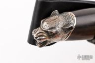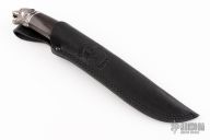 This knife from Nord Crown features a Damascus spear point blade with fullers and false top edge, .222" blade stock and 1.167" blade depth, hidden tang construction. The handle has a silver guard and butt with a Puma 's head, with an ebony wood grip. Comes with a black leather sheath and original box and papers. Has a couple spots on the blade, excellent condition otherwise.