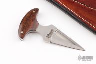 This push dagger by Devon Butch Beaver features a mirror polished double edged blade with .121" blade stock and .827" blade depth, full tang construction with wood scales and nickel silver pins. Comes with a brown leather wallet sheath and maker's card. Excellent condition.
