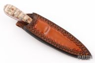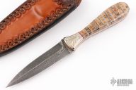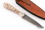 This fixed blade by JR. Gray features a Damascus double edge blade with 0.150" blade depth and .935" blade depth, full tang construction. The handle has engraved nickel silver bolsters, mammoth ivory scales, red fiber liners and mosaic pins. Includes a hand tooled brown leather sheath with belt loop. Also includes signed COA from maker. Has some scuffs and patina, otherwise excellent condition. "JR. GRAY '05" on the underside of the tang.