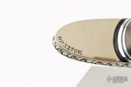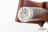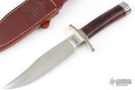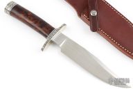 This "Nordic Knives Special Bowie" was made by Randall and originally sold by Nordic Knives. It has a satin finished blade with sharpened top edge, .219" blade thickness and 1.361" blade depth, hidden tang construction. The handle has a nickel silver forward curved hilt, desert ironwood burl grip with black and duralumin liners, nickel silver butt. #840 on back side of blade. Comes with a brown leather sheath and a zippered case. Excellent condition. The guard and butt have been engraved by David Perdue. Marked DP327NK under the guard.
