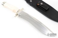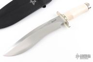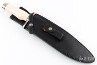 This Sasquatch by Randall Made Knives features a satin finished carbon steel blade with sharpened top edge, .329" blade stock and 2.240" blade depth, hidden tang construction. The handle has a forward curved nickel silver guard and butt, single finger groove ivorite grip with black spacers. Comes with a black leather sheath and zippered case. Excellent condition. #963