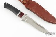 This Baby Hattori Fighter by Junglee Knives features a satin finished recurve blade with false top edge and partial serrations, .198" blade stock and 1.353" blade depth, hidden tang construction. The handle has a nickel silver guard with checkered rubber grip, nickel silver and wood spacers. Comes with a brown leather sheath. Excellent condition.