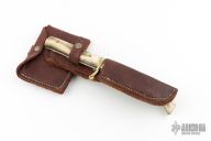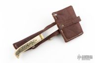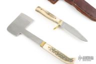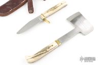 This Hunter/Axe Combo by "Bobby" (please let us know if you recognize this maker) feautres a knife with a satin finished blade and false top edge, .194" blade stock and 1.043" blade depth, full tang construction. The handle has a brass guard, stag scales and brass pins. The axe has a matching handle, the blade was made from a sawblade by NAP Tools, .194" blade stock and a 2.75" blade depth, full tang construction. Comes with a brown leather sheath that holds both the knife and the axe. Has some light scratches and oxidation, otherwise good condition.