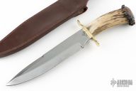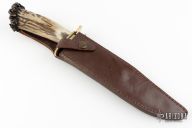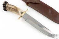 This knife by Gary McCafferty features a satin finished blade with false top edge, .175" blade stock and 1.584" blade depth, hidden tang construction. The handle has a brass guard and a crown stag grip. Comes with a brown leather sheath. Has some light scratches and patina, otherwise good condition.