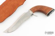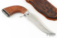This knife by Fred Martinez features a nearly mirror polished blade with false top edge, .146" blade stock and 1.767" blade depth, hidden tang construction. The handle has a stainless steel guard and a wood grip with white/black spacers and a buffalo horn butt. Comes with a hand tooled brown leather sheath. Has some light scratches, otherwise excellent condition.