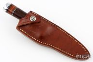 This Model 26 Pathfinder by Randall Made Knives is one of Randall's best-selling models. It features a drop point satin finished blade with .159" blade stock and .912" blade depth, hidden tang construction. The handle has a nickel silver guard and duralumin butt, ironwood grip and black/duralumin/leather spacers. Comes with a brown leather sheath. Has a few light scratches, and some patina otherwise excellent condition.