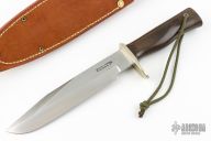 This Model 14 by Randall Made Knives features a satin finished blade with sharpened top edge and notched thumbrest, .222" blade stock. 1.403" blade depth, full tang construction. The handle has a nickel silver guard, green linen micarta handle with a lanyard hole at the butt. This knife was designed to meet the demand for an almost indestructible all-purpose knife, though it is especially suited for combat and survival purposes. Comes with brown Peloza Leather sheath. Has a couple light scuffs and some patina, otherwise excellent condition.