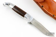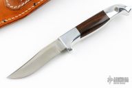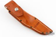 This Steel Head by Ruana features a satin finished blade with false top edge, .114" blade stock and .807" blade depth, hidden tang construction. The handle is cast from aluminum with ironwood inserts. Comes with brown leather sheath. Has scuffs and scratches, good condition.