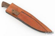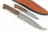This hunter's set by Mike Sanders has a large and a smaller blade. The large blade has a bead blast finished blade with false top edge, .159" blade stock and 1.460" depth, full tang construction. Handle has green canvas micarta scales with lanyard hole. The smaller blade has a bead blast finished blade with false top edge, .125" blade stock and .908" depth, full tang construction. Handle has green canvas micarta scales with lanyard hole.  Comes with a brown leather sheath that holds both knives. Has some light patina/oxidation spots, otherwise good condition.