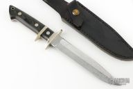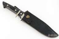 This Sub-Hilt Fighter from Steve Voorhis features a mirror polished clip point blade with sharpened top edge, .176" blade stock and 1.121" blade depth, full tang construction. The handle is comprised of a nickel silver guard and sub hilt, black linen micarta scales over red liners. Comes with black leather sheath. Has some light scratches and patina, otherwise good condition.