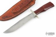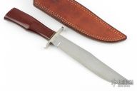 This Morseth Fighter has a satin finished laminated steel blade with hidden tang construction and a false top edge, .185" blade stock and 1.156" blade depth. The handle has a nickel silver double guard, maroon linen micarta grip and black/white spacers. Has some light scratches and patina, otherwise good condition. Comes with brown leather sheath.