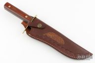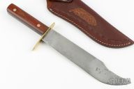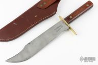 This Bowie by True Temper is dated 1944, it has a satin finished blade with false top edge, .105" blade stock and 1.666" blade depth, full tang construction. The handle has a brass guard and brown paper micarta scales. Comes with a hand tooled brown leather sheath (not original but fits). Has some scratches and patina, otherwise good condition for its age.