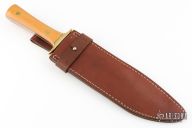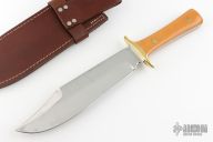 This bowie by Art Wiman features a mirror polished clip point blade with false top edge, .246" blade stock and 2.100" blade depth, full tang construction. The handle has a brass guard with yellow paper micarta scales and aluminum liners. Comes with a brown leather sheath. Has some light scratches, otherwise excellent condition. Hand signed "Wiman" on the blade.