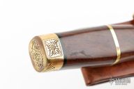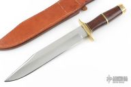 This Bowie by Harold Corby features a mirror polished blade with a false top edge, .173" blade stock and 1.467" depth, hidden tang construction. The handle has an engraved brass guard and butt, cocobolo grip with black and brass spacers. Comes with a brown leather sheath. Excellent condition.