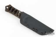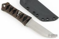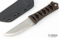 This Tanto by Pohan Leu features a satin finished scandi ground blade with .128" blade thickness and 1.109" blade depth. Japanese style wrap with brown cord over black stingray skin. Comes with Kydex sheath. Excellent condition.
