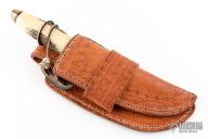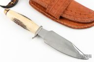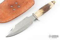 This Bowie by "JBW" (please let us know if you know who this maker is) features a mirror polished blade with false top edge, .257" blade stock and 1.878" blade depth, hidden tang construction. The handle has a stainless steel guard, brass butt and a stag grip. Comes with a hand tooled brown leather sheath. Has some light scratches and patina, otherwise good condition.