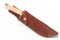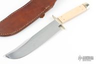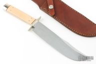 This Bowie by Steve Voorhis features a mirror polished clip point blade with false top edge, .225" blade stock, 1.685" blade depth, full tapered tang construction. The handle has a nickel silver guard and rear bolsters, ivory paper micarta scales with red spacers. Comes with a brown leather sheath. Has some light scratches and light patina/pitting, otherwise good condition.