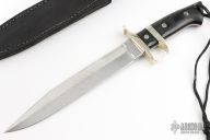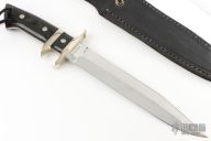 This Sub Hilt Fighter from Steve Voorhis features a mirror polished clip point blade with sharpened top edge, .237" blade stock and 1.367" blade depth, full tapered tang construction. The handle is comprised of a nickel silver guard and sub hilt, black linen micarta scales over red liners. Comes with black leather sheath. Has a couple light scratches, some patina and light oxidation, otherwise goo dcondition.