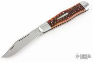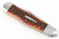 This Coke Bottle Back Pocket by Jason Taber features a hand rub satin finish clip point blade with swedge, nail nick and long pull. The handle is comprised of stainless steel cap and bolsters with jigged bone covers and steel bullet shaped escutcheon over stainless steel liners and backspring. This knife has a half stop and is flush in all positions. Excellent condition.