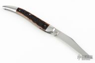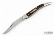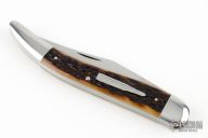 This Texas Toothpick by Reese Bose features a hand rub satin finished blade with nail nick. The handle has stainless steel bolsters and cap, Remington jigged bone covers with bullet escutcheon, stainless steel liners, stainless steel spring. #5 on blade. Excellent condition.
