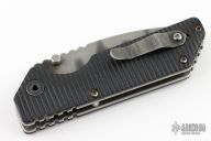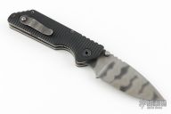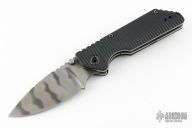 This AR folder by Strider features a tiger stripe finish drop point blade with dual thumbstuds and a notched thumbrest. The handle has textured G10 scales, tumbled titanium liners andtip up clip. Notches on thumbrest, lockup and rear of handle. Has some light scuffs and scratches, otherwise good condition. The thumbstuds spine in the blade.