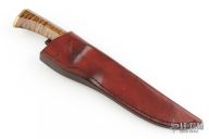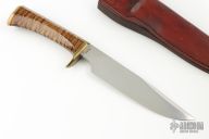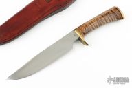 This Bowie by Master Smith C Robbin Hudson features a hand rub satin finished blade with false top edge, .322" blade stock and 1.391" blade stock, hidden tang construction. The handle has a brass guard and butt, and an octagonal shaped curly maple wood grip. Comes with a brown leather sheath. Has some light scratches and a couple light spots on the blade, excellent condition otherwise.