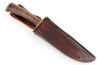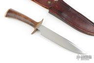 This Fighter by Master Smith C Robbin Hudson features a hand rub satin finished blade with a nearly sharpened top edge, visible temper line, .326" blade stock and 1.315" blade stock, hidden tang construction. The handle has a brass guard and butt, and an octagonal shaped walnut grip. Comes with a brown leather sheath. Has some light scratches and a couple light spots on the blade, excellent condition otherwise.