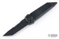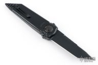 This Dreddlock model sports a black handle with a bullseye laser etching and a CPM-S30V steel blade with a black cerakote finish. The top edge of the knife has been sharpened and serrated.