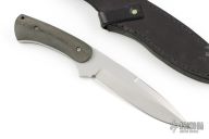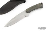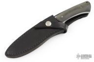 This knife by John Salley features a bead blast finished blade with sharpened top edge and a notched thumbrest, .236" blade stock and 1.304" blade depth, full tang construction. The handle has black linen micarta scales. Comes with a black leather sheath. Has some light spots on the blade, otherwise excellent condition.