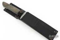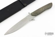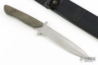 This is a rare pre-Benchmade Pacific Cutlery Fer De Lance. Design by David Steele. Bead blasted blade with sharpened top edge, .176" blade stock and 1.215" blade depth, full tang construction. The handle has black linen micarta scales with lanyard hole. Comes with black nylon sheath. Excellent condition.