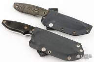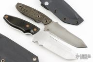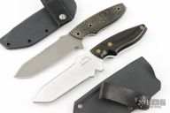 This knife by Steve Ryan features a bead blast finished chisel ground blade with a sharpened top edge and a textured thumbrest, .165" blade stock and 1.249" blade depth, full tang construction. The handle has contoured and textured green canvas micarta scales. Comes with a kydex sheath. Has a few light scuffs and scratches, otherwise excellent condition.