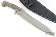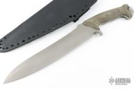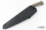 This large fixed blade by Steve Ryan features a bead blast finished blade with sharpened top edge, notched thumbrest, .258" blade stock and 2.164" blade depth, full tang construction. The handle has sculpted green canvas micarta scales and a lanyard hole at the butt. Comes with a kydex sheath with TekLok. Has a couple light scuffs, excellent condition otherwise.