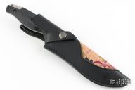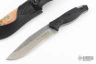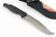 This knife by SOG features a hammer marked blade with san mai recurve blade with notched thumbrest, .209" blade stock and 1.342" blade depth, full tang construction. The handle has black plastic scales. Comes with original sheath. Excellent condition.