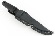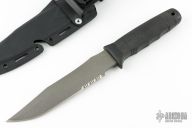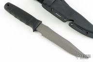 This Seal 2000 Fighter by SOG Knives has a grey coated partially serrated clip point blade with hidden tang, .236" blade stock and 1.378" blade depth. Handle is contoured glass reinforced nylon with lanyard hole. Comes with a kydex sheath. Excellent condition.