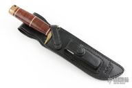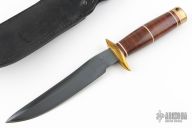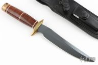 This SBR-80 Recon Bowie has a blued blade with hidden tang and brass double guard. Blade width is 1/4", depth 1-3/16". Handle is stacked leather with white spacers, brass double guard, and brass butt cap with lanyard hole. Comes with a black leather sheath. Has a little patina, otherwise excellent condition.