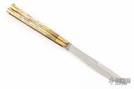 This balisong from the Philippines features a spear point blade with a satin finish. The handle has brass bolsters, front and rear and jigged bone scales, brass T-latch. Has a couple light scratches and patina, otherwise good condition.