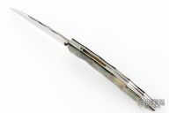 This Linerlock by Koji Hara features a mirror polished Cowry-Y blade and a black lip pearl inlaid thumbstud and carved blade spine. The handle has black lip pearl with nickel silver spacers/liners, it is sculpted to have the contours of a piece of bamboo. Nice blade seating, detent and lock up. Excellent condition. Comes with a zippered case.