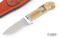 Classic designed hunter with mirror polish blade and bolster cast as one piece. Full tapered tang construction. Blade is 3/16" thick and 1" deep. Beautiful sheep horn scales. Stamped "06 19C27 U.S.A." on tang spine. Comes with leather sheath and original box with papers. Has a couple light scratches, excellent condition otherwise.