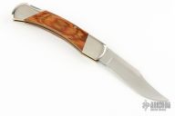 This lockback from Bowen USA features a high satin finished blade with nail nick and notched thumbrest. The handle has nickel silver front/rear bolsters, wood covers, brass liners and stainless steel backspacer. Comes with original box. Has a couple light scratches, excellent condition otherwise.