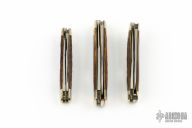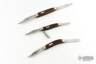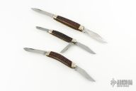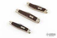 This lot of slip joints by John Primble knives all feature two mirror polished blades. Nickel Silver front and rear bolsters with stag covers. Brass liners and steel springs. Original boxes. Excellent Condition.