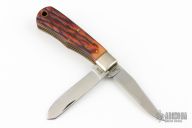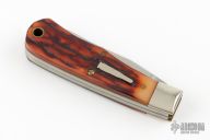 This Bullet Knife by Remmington has two satin finished blades with nail nicks. The handle has nickel silver bolsters, stag covers, brass liners and steel springs. Includes the original box and papers. Excellent Condition.