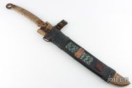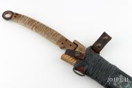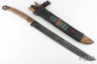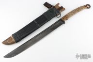 This Swamp Sword by Pirate Forge features a forged 80crv2 steel blade with force patina finish, fullers and false top edge, .169" blade stock and 2.085" blade depth, full tang construction. The handle has weathered Teak Wood bolster and end piece, hollow copper pins, epoxy sealed hemp wrap, hammered copper end hoop liner. Pirate Forge heat treat, drifted end hoop, flat primary bevels with half length fuller to convex spine that blends into a false edge from end of fuller to tip of sword. Comes with a 3 piece poplar wood construction sheath with tooled leather, hemp, snakeskin, copper, and hand forged rings. Has a couple light scratches, otherwise excellent condition.