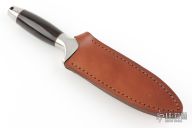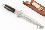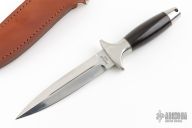 This Trooper by Kershaw Knives is a mirror polished double-edged dagger with fullers, .215" blade stock and .937" blade depth, hidden tang construction. The handle has a stainless steel guard and butt with wood grip and brass spacers, lanyard hole at the butt. Comes with a brown leather sheath, original box, S/N 19468.  Excellent Condition.