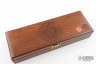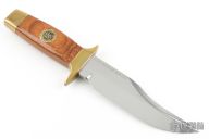 This fixed blade by Smith and Wesson features a wood handle with brass guard and butt cap. Mirror polished bowie style blade with .246" blade stock and 1.360" blade depth. Has "Texas Rangers 1823-1973" stamped on blade and a "Texas Rangers Commemorative Commission" inlay on handle. Excellent condition. Includes wooden display box. "TR19546" stamped on the spine of the blade.
