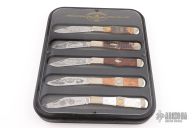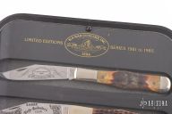This Simited Editions Series 1981-1985 by Ka-Bar features 5 knives, one from each year for the Knife Collectors Club. The blades are etched on the A-Side. The handles have nickel silver bolsters and butt, brass liners, and stainless springs. The Covers are stag, jigged bone, dymondwood, bone, and pearl. Comes with display case. Excellent condition.