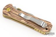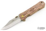 This Moonshiner Linerlock Knife by Emerson Knives features a satin finished blade with notched thumbrest and anodized titanium thumbdisc. The handle has whiskey barrel wooden scales, anodized titanium liners, tip up stainless steel clip. Comes with original box. Excellent condition.