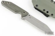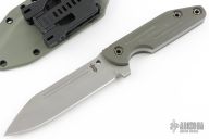 This Dauntless Fixed Blade by Kingdom Armory features a bead blast finished blade with notched thumbrest and fullers, .252" blade stock and 1.296" blade depth, full tang construction. The handle has green G-10 scales. Comes with a green kydex sheath with TekLok. Excellent condition. #4