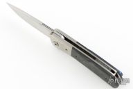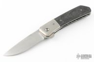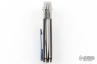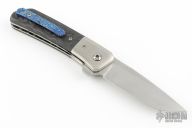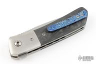 This Hostile Gentleman by Mark Roe features a satin finished blade with a notched thumbrest and flipper. The handle has satin titanium bolsters, marble carbon fiber scales, satin titanium liners, marble carbon fiber backspacer, timascus tip up clip. Rides on bearings, nice detent, lockup and blade seating. Comes with a zippered case and COA. Has a few light scratches, otherwise excellent condition.