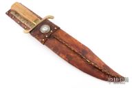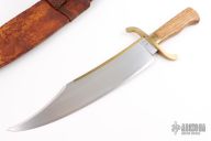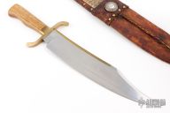 This Musso style Brass Back Bowie by James R Cook features a hand rub satin finished blade with brass parry guard on blade spine, false top edge and a visible temper line, .285" blade stock, 2.462" blade depth, hidden tang construction. The handle has a brass S-guard and collar, (hickory?) wood grip. Comes with a brown rawhide leather sheath with snake skin inlay, nylon zippered case and COA dated 5-1-2018. Has some light scratches, excellent condition otherwise.