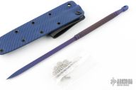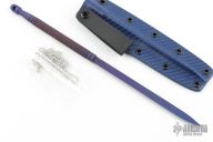 The Devil Dart from Pat Crawford is an anodized titanium sleeve dagger. It is designed and refined after seeing the OSS sleeve dagger from World War II. The blade is triangle shaped for strength and easy penetration. The handle is knurled for a sure grip. Each dart is individually hand ground and bead blasted for the highest quality. .360 diameter. Comes with a kydex sheath. New from maker!